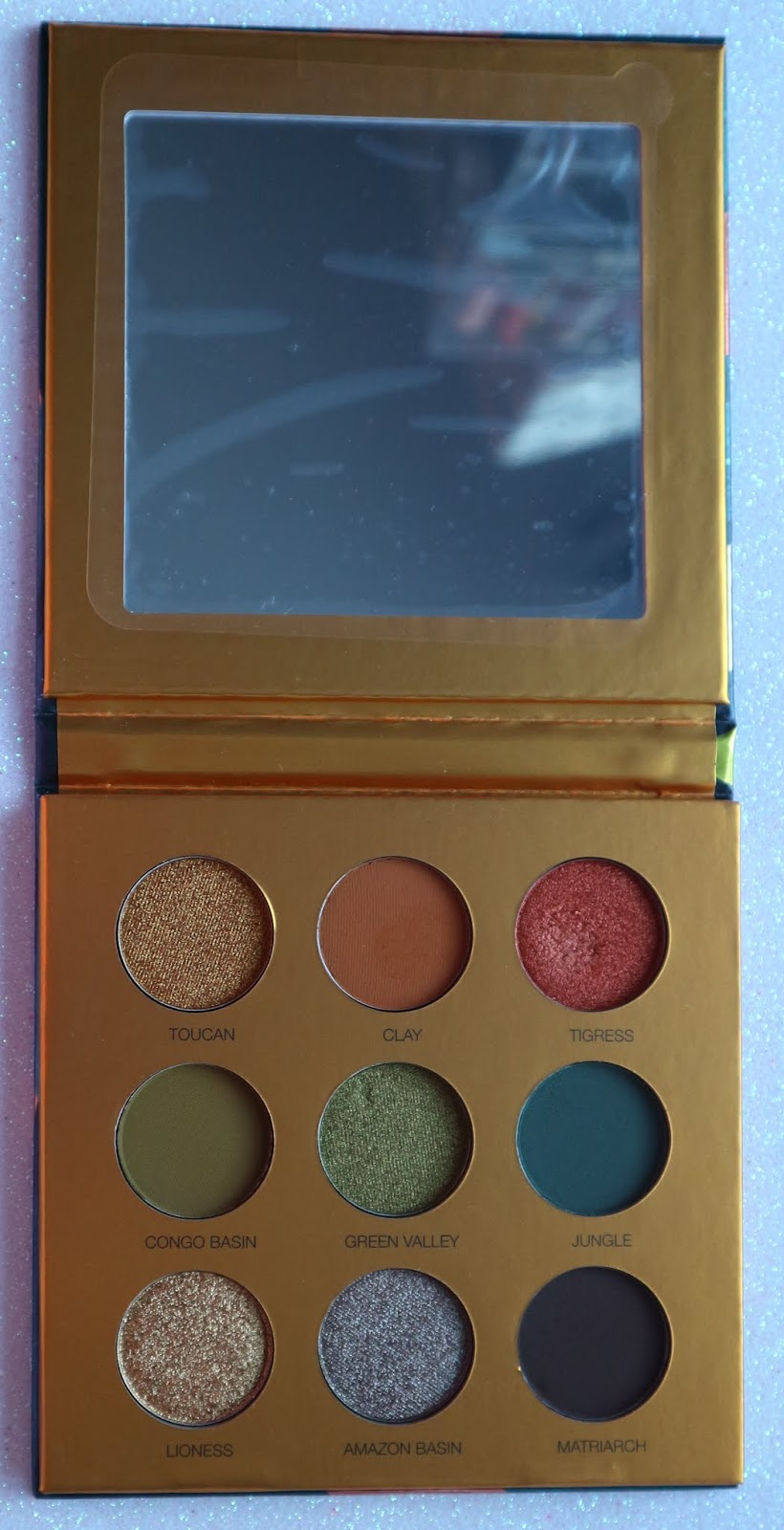 O interior da paleta é todo em dourado alaranjado metálico e como disse na tampa ela tem um espelho e na parte que tem as sombras, por baixo de cada uma, tem o nome da mesma num lettering preto.