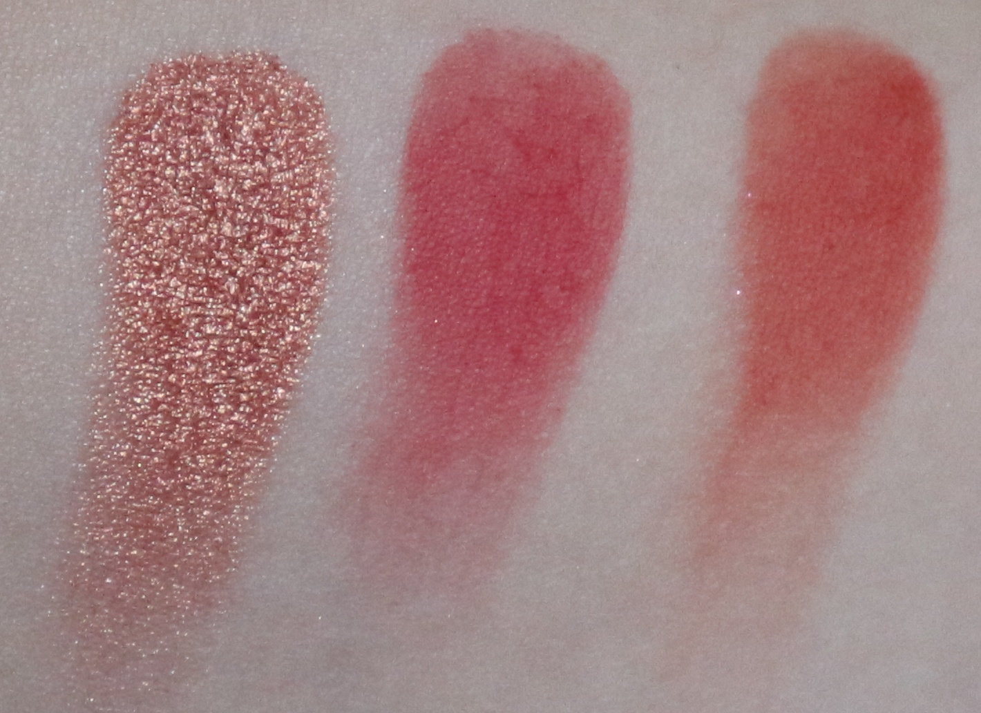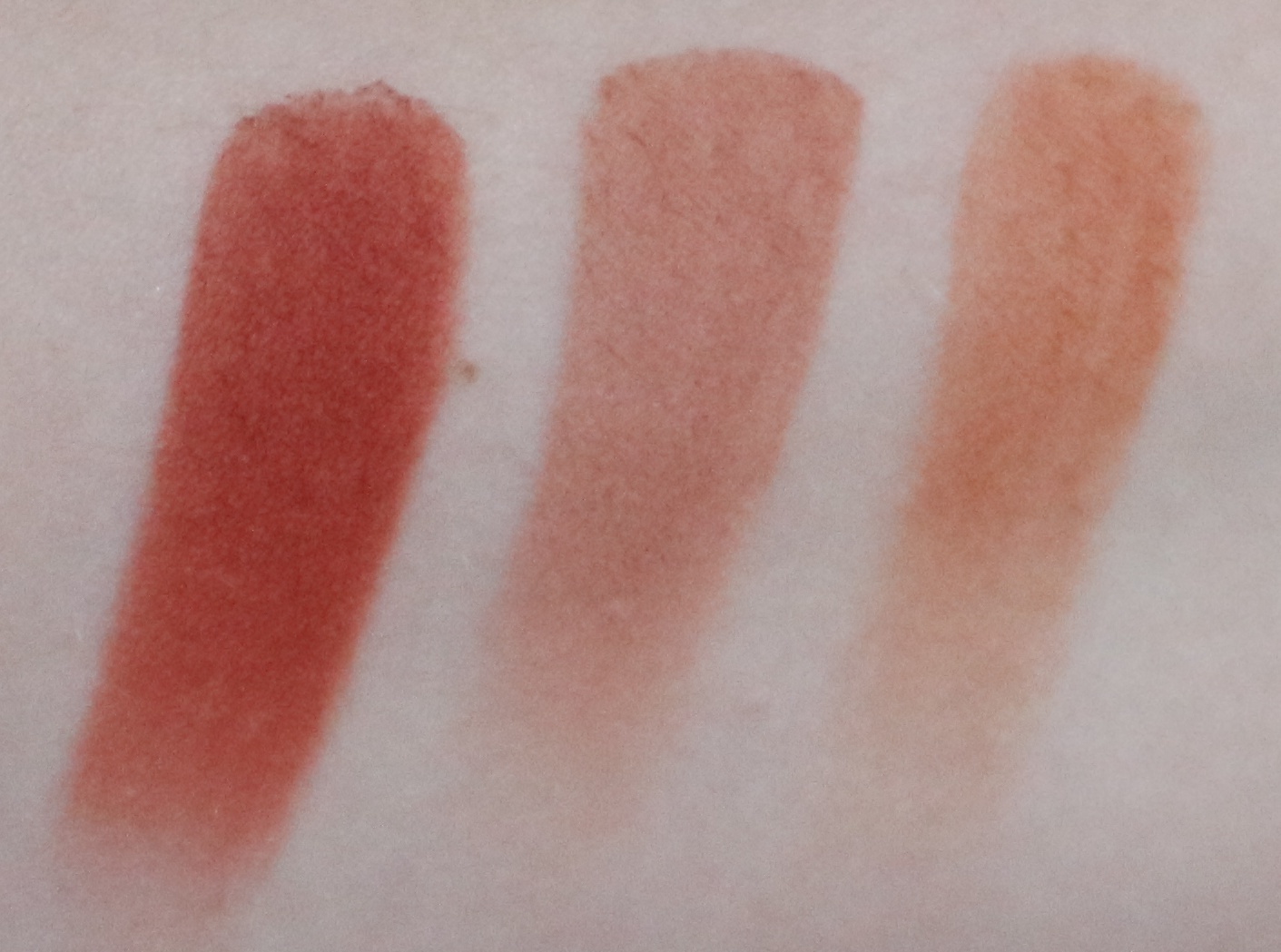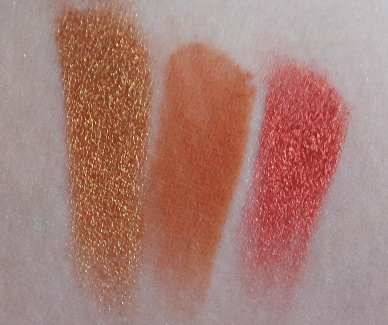 A primeira sombra da primeira fila é um tom de cobre alaranjado muito claro de fundo rosado com acabamento metálico, logo em seguida temos um tom de vermelho médio rosado e por fim um tom de tijolo com fundo avermelhado. Estas duas ultimas sombras de que falei são ambas de acabamento mate.