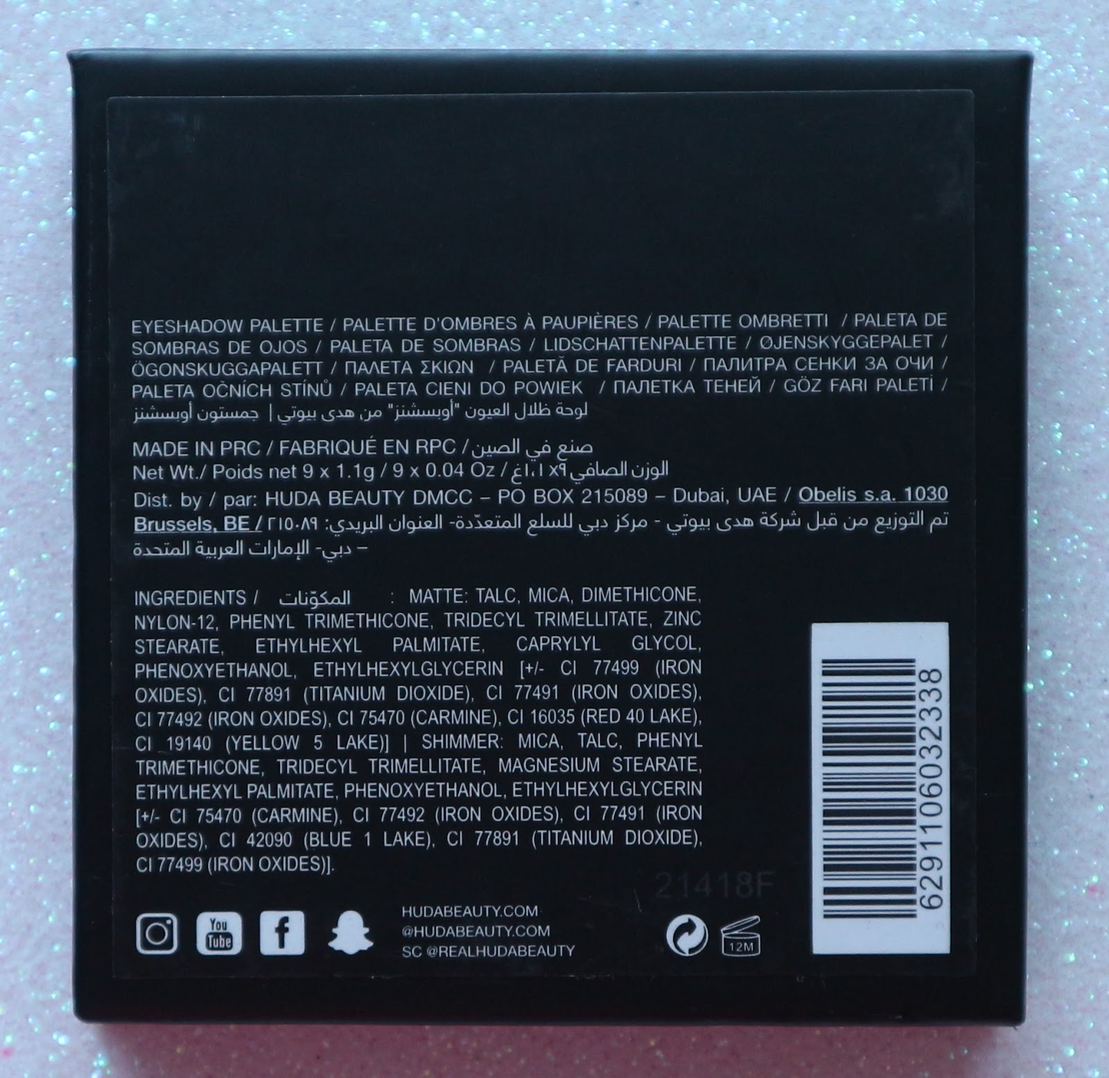 Na parte de trás a paleta tem exactamente o mesmo padrão, mas por cima tem um autocolante preto com todas as informações acerca da paleta e também da marca, como ingredientes, peso, modo de uso, entre outros.