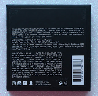 A parte de trás da paleta é toda neste bordo escuro e trás num lettering dourado algumas informações relativas à mesmo, como peso, data de validade, Batch, entre outras.